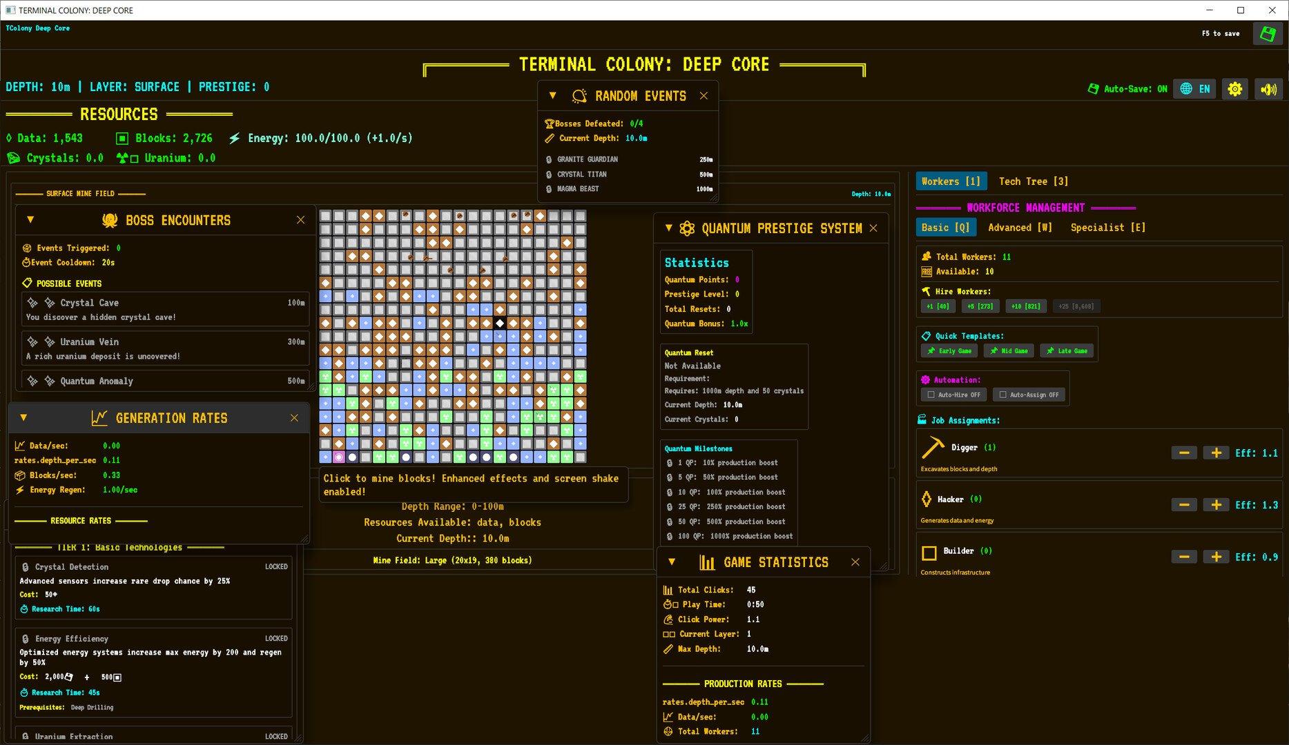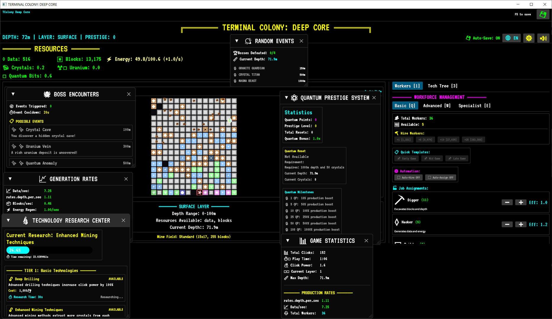 Полностью локализована на 14 языках, включая английский, немецкий, китайский, японский, корейский, арабский, французский, турецкий, польский, итальянский, русский, испанский, украинский и румынский. Управляйте колонией: нанимайте и распределяйте работников на специализированные задачи с визуальным представлением. Бурите глубже через 4 геологических слоя с процедурно генерируемыми блоками. Используйте систему квантового престижа для сброса прогресса с постоянными бонусами через квантовые очки. Развивайте технологии по трём уровням - базовому, продвинутому и квантовому - с ощутимыми апгрейдами (горячая клавиша T). Автоматизируйте производство: развёртывайте квантовый экскаватор, рои дронов с 5× эффективностью и устанавливайте AI Core (каждое даёт +10%). Управляйте экономикой из 7 взаимосвязанных ресурсов, открывайте более 15 достижений с постоянными бонусами, сталкивайтесь со случайными событиями и боссами, участвуйте в эпических сражениях с отдельными кнопками атаки, индикаторами здоровья и ценными наградами. Постоянный прогресс обеспечивается автосохранением и ручным сохранением (F5), чтобы ваша колония никогда не останавливалась.